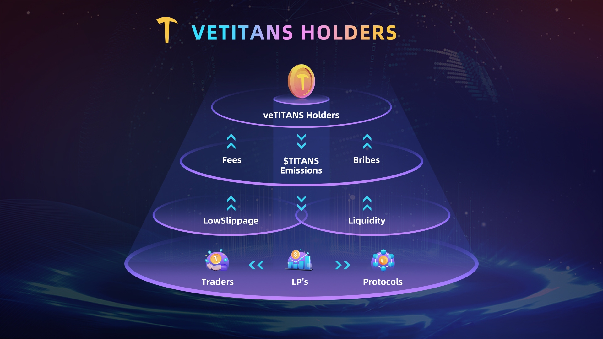 Protocols — have access to a cooperation oriented liquidity layer. They benefit from capital efficient trading conditions for their tokens, and they can incentivize their liquidity via bribes offered to veTITANS holders.